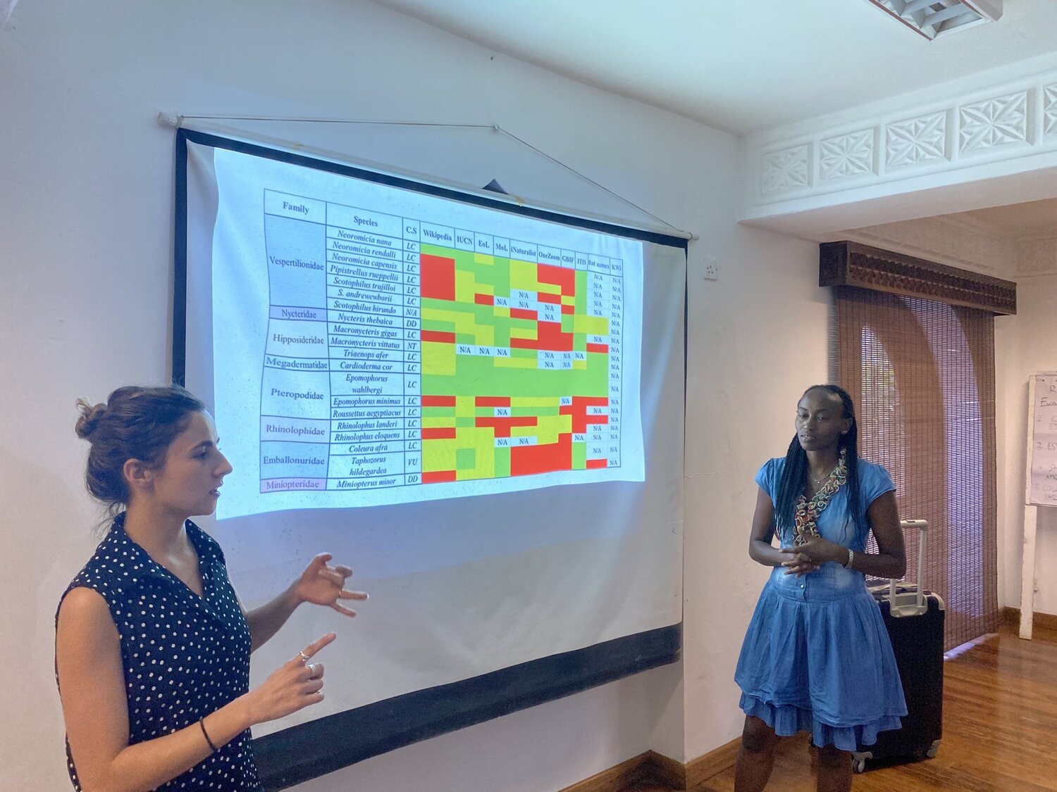 During the course, we studied about 20 bat species, which occurred at the Jacaranda Hotel, Diani Bay Resort, Shimoni Caves, and the Fikirini Three Sisters Caves in Kwale County, Kenya. To accomplish our assignment, we worked with the ten most commonly used open-access online platforms where the general public could easily access information. These were: Wikipedia, International Union for Conservation of Nature (IUCN), Encyclopedia of Life (EoL), Map of Life (MoL), iNaturalist, OneZoom, GBIF, the Integrated Taxonomic Information System (ITIS), Bat Names and the Kenya Wildlife Service (KWS) website. For each species, we compiled available data from these online platforms based on specific attributes including diagnostic traits (taxonomy), diet, distribution, conservation status, reproduction, ecology, threats, image, and references. This information served as the backbone, and we chose to generate a heat map to show our results. Species not evaluated or having no information at all were assigned a white color, those with 1-2 attributes, red color for insufficient information, yellow color for those having up to 6 attributes, and green for those with more than 7 attributes. This was the result:
